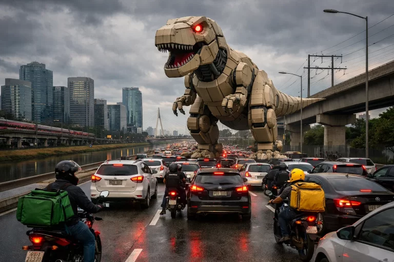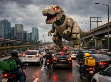SÃO PAULO – Um robossauro de 17 metros de altura atravessa lentamente a Marginal Pinheiros, sentido Castelo Branco, e transforma o já lendário…