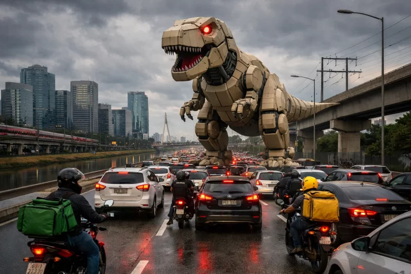 SÃO PAULO – Um robossauro de 17 metros de altura atravessa lentamente a Marginal Pinheiros, sentido Castelo Branco, e transforma o já lendário trânsito paulistano em uma performance distópica ao ar livre.